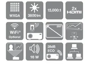 Excellent visibility for every student With this WXGA projector ,content will be bright, vivid and clear, ensuring that everyone can engage with the lesson. Providing excellent visibility, this projector is scalable up to 300 inches and is bright even in high ambient lighting conditions. It’s all thanks to the high 3,800-lumen output and 15,000:1 contrast ratio.